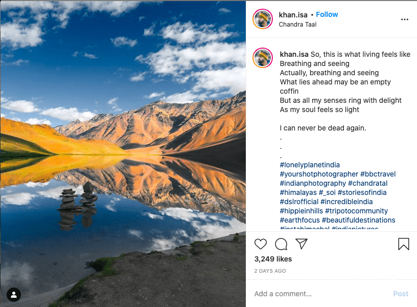 I was actually never a writer and to be honest, it doesn’t come naturally to me. It is somewhat an imposition of Instagram that makes me write these captions. However, very rarely do I think of captions while posting something. Most of them are my leading thoughts on random days. I carry a notebook and write down the fleeting thoughts that come to my mind. Of course, being in the mountains is immensely helpful and makes one introspect a lot. Apart from that though, there’s really nothing special that I do. It’s only after travelling that I could write this much.